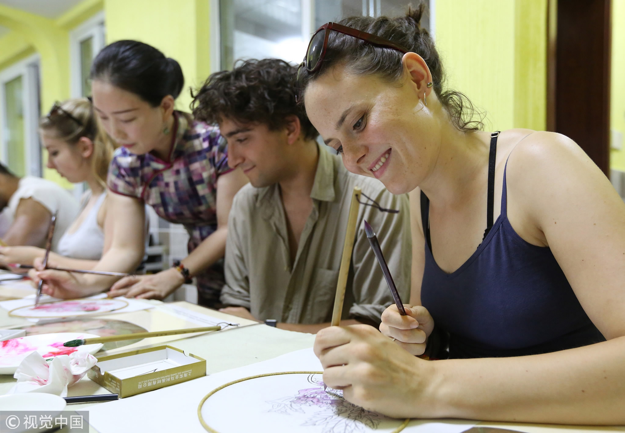 July 24, 2017: British students from the Confucius Institute of Goldsmiths University learn to paint the round fan, in Zhenjiang, Jiangsu Province. /VCG Photo