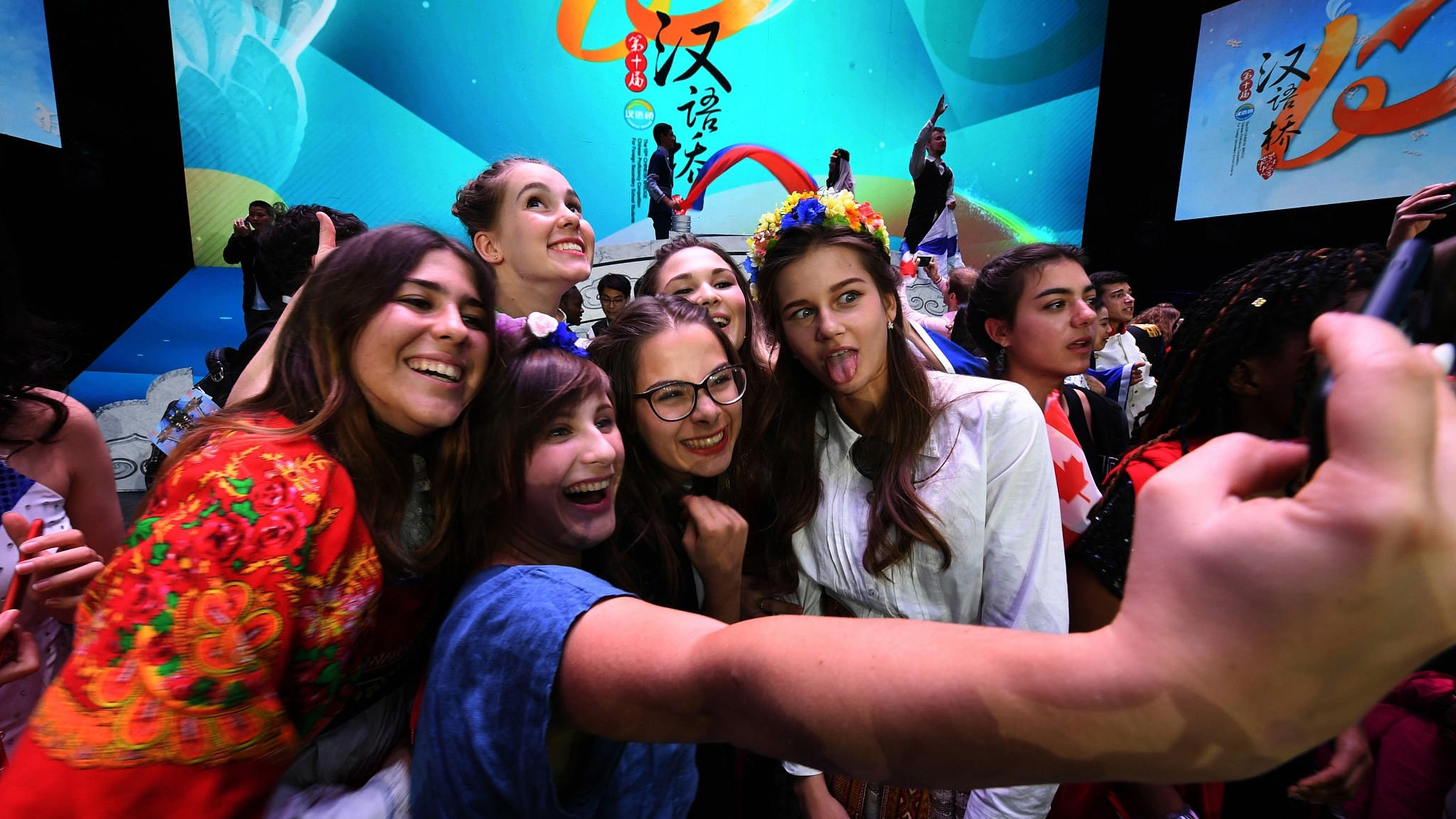October 28, 2017: Candidates take selfies at the closing ceremony of the 10th "Chinese Bridge" Competition in Kunming, Yunnan Province. /VCG Photo