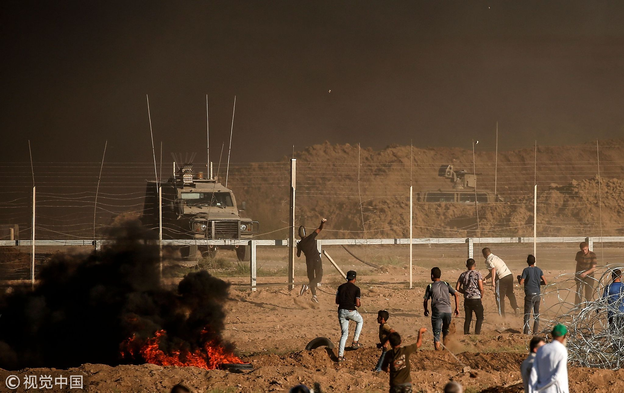 Palestinian protesters throw stones toward Israeli forces during a demonstration along the border between Israel and the Gaza strip, July 27, 2018. /VCG Photo