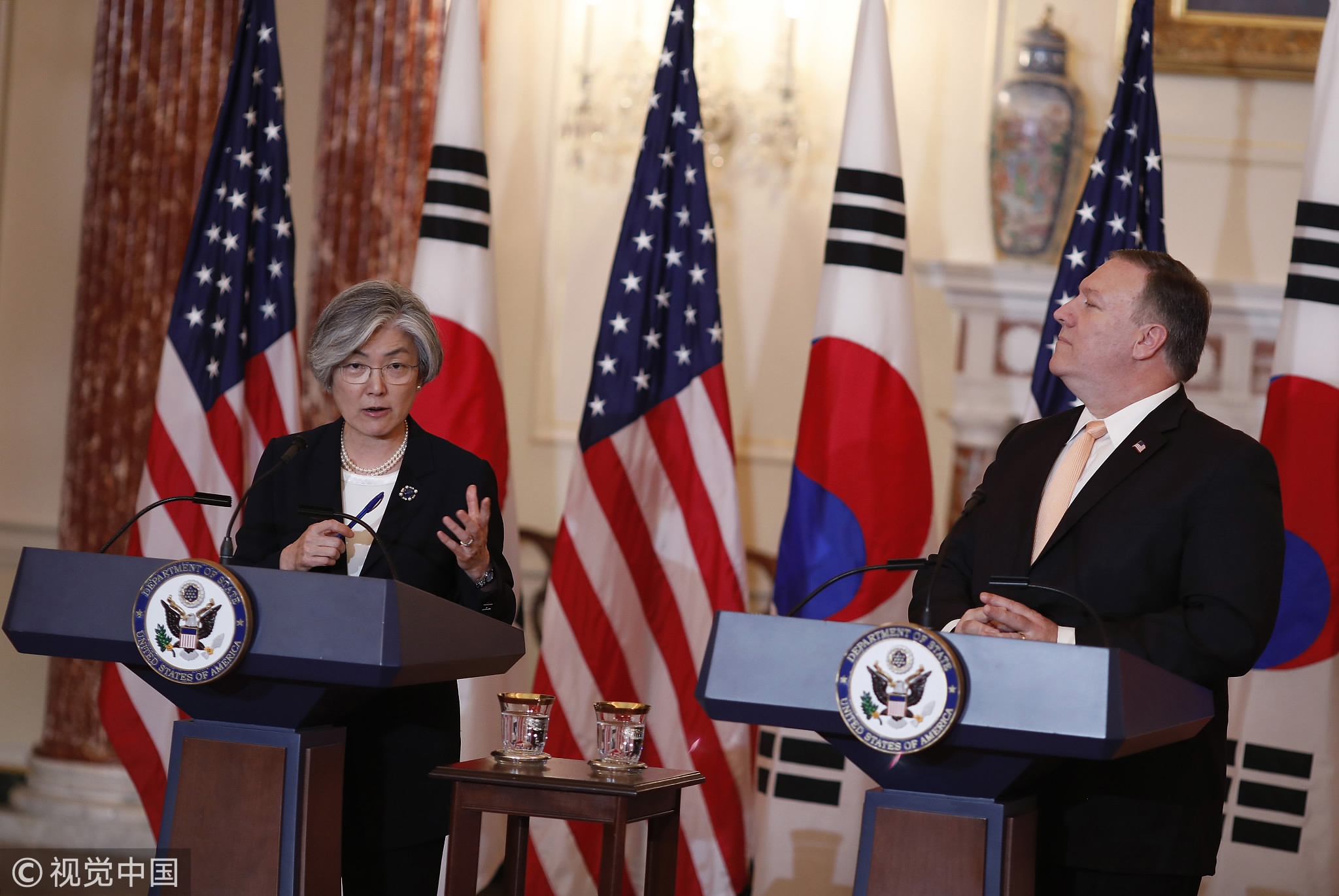 Kang Kyung-wha, South Korea's foreign minister, speaks as Mike Pompeo, US secretary of state, listens during a news conference in Washington, D.C., US, May 11, 2018. /VCG Photo