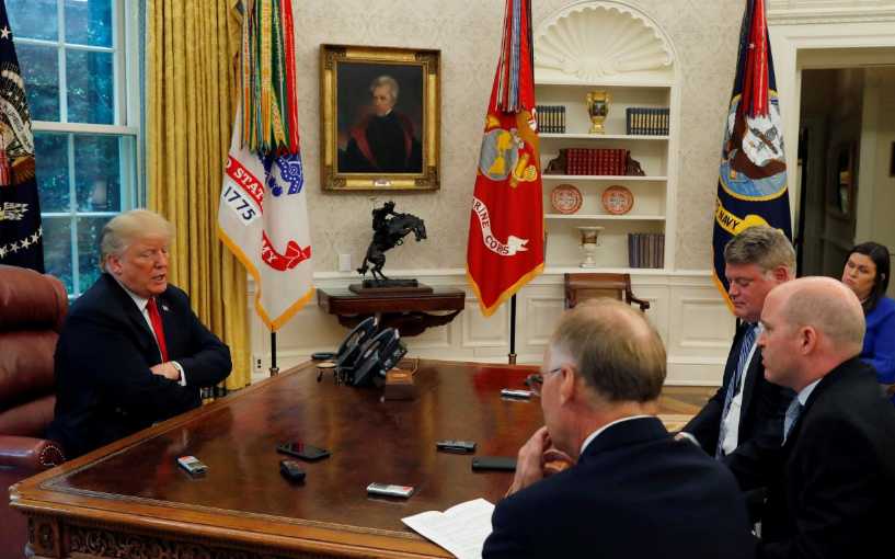 US President Donald Trump answers questions from Reuters reporters Steve Holland, Jeff Mason and James Oliphant as White House Press Secretary Sarah Huckabee Sanders listens during the interview inside the Oval Office of the White House in Washington, US on August 20, 2018. /Reuters Photo