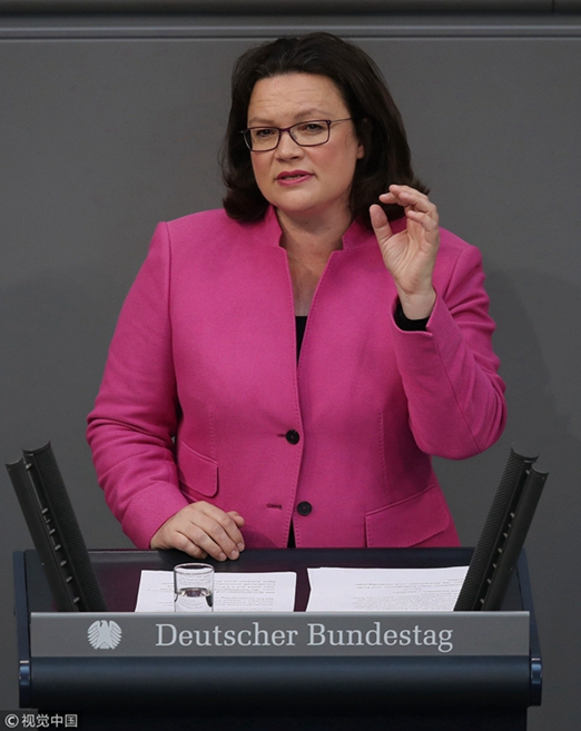 Andrea Nahles, head of the Bundestag faction of the German Social Democrats (SPD), speaks during debates after German Chancellor Angela Merkel gave a government declaration at the Bundestag ahead of the upcoming EU and NATO summits in Berlin, Germany, June 28, 2018. /VCG Photo