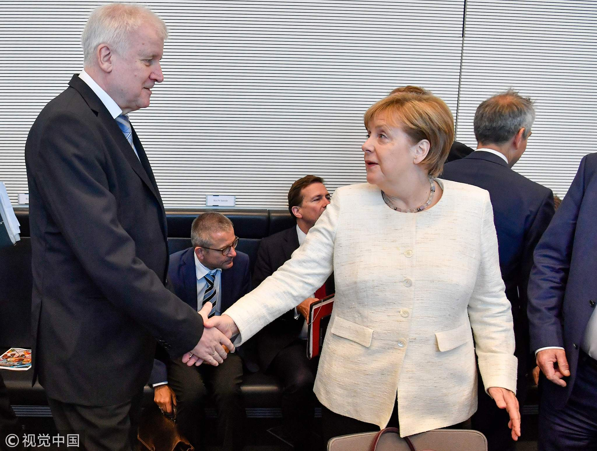German Chancellor and leader of the Christian Democratic Union (CDU) Angela Merkel and German Interior Minister and leader of the Bavarian Christian Social Union (CSU) Horst Seehofer shake hands at the start of a CDU/CSU parliamentary group meeting in Berlin, Germany, July 3, 2018. /VCG Photo