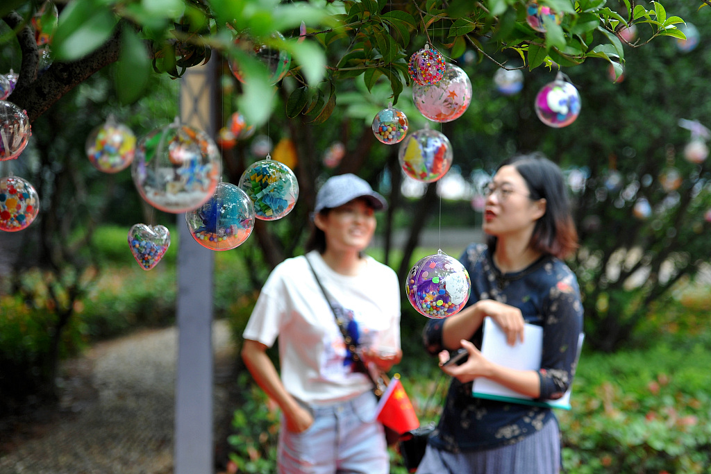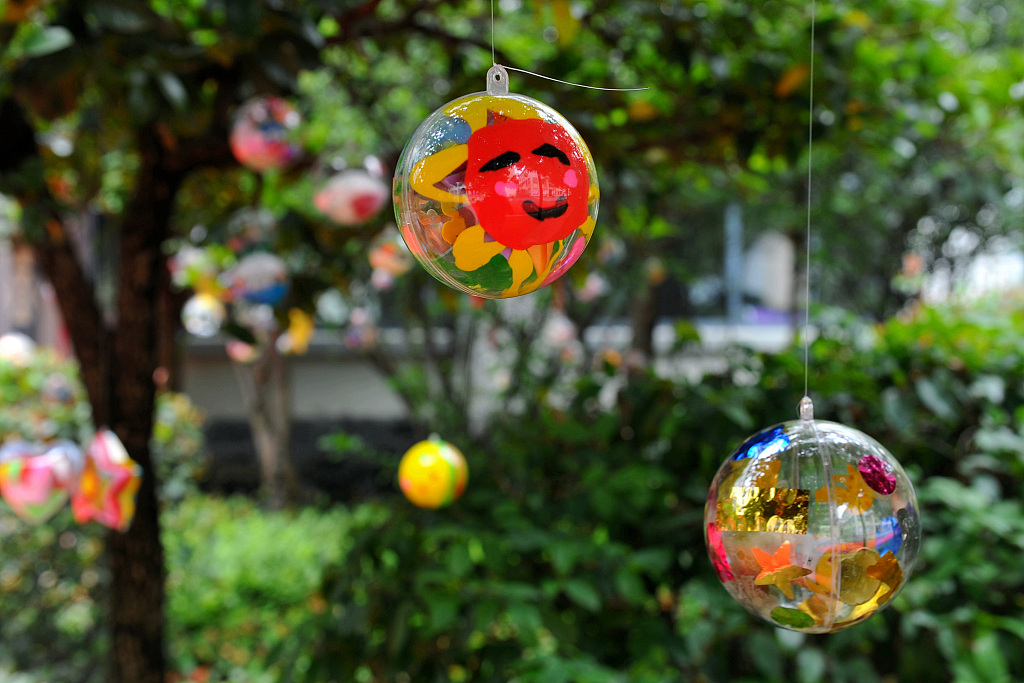 About 600 first-grade elementary students decorated the campus with their wishing balls in Jinhua, east China's Zhejiang Province, on June 1, 2019. /VCG Photo