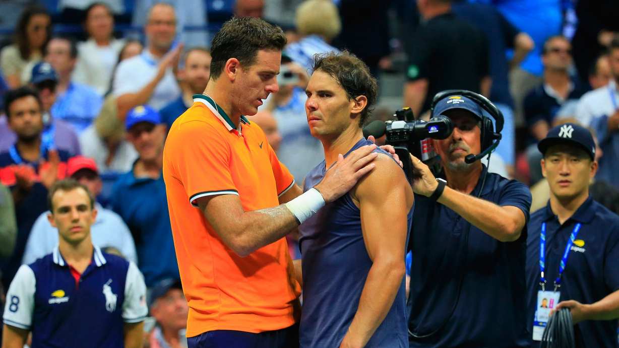 Rafael Nadal of Spain (R) hugs Juan Martin del Potro of Argentina after he is forced to retire due to injury in his men's singles semi-final match on Day Twelve of the 2018 US Open at the USTA Billie Jean King National Tennis Center, New York City, September 7, 2018. /VCG Photo