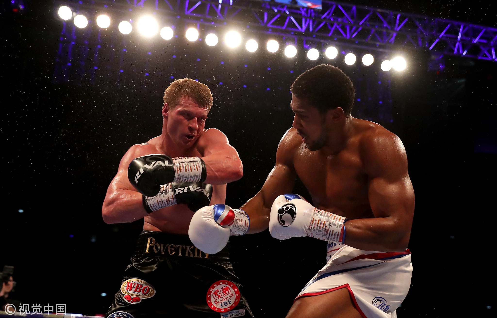Alexander Povetkin punches Anthony Joshua in the match of Anthony Joshua vs Alexander Povetkin for WBA Super, IBF, WBO & IBO World Heavyweight Titles at Wembley Stadium, London, Britain, September 22, 2018. /VCG Photo