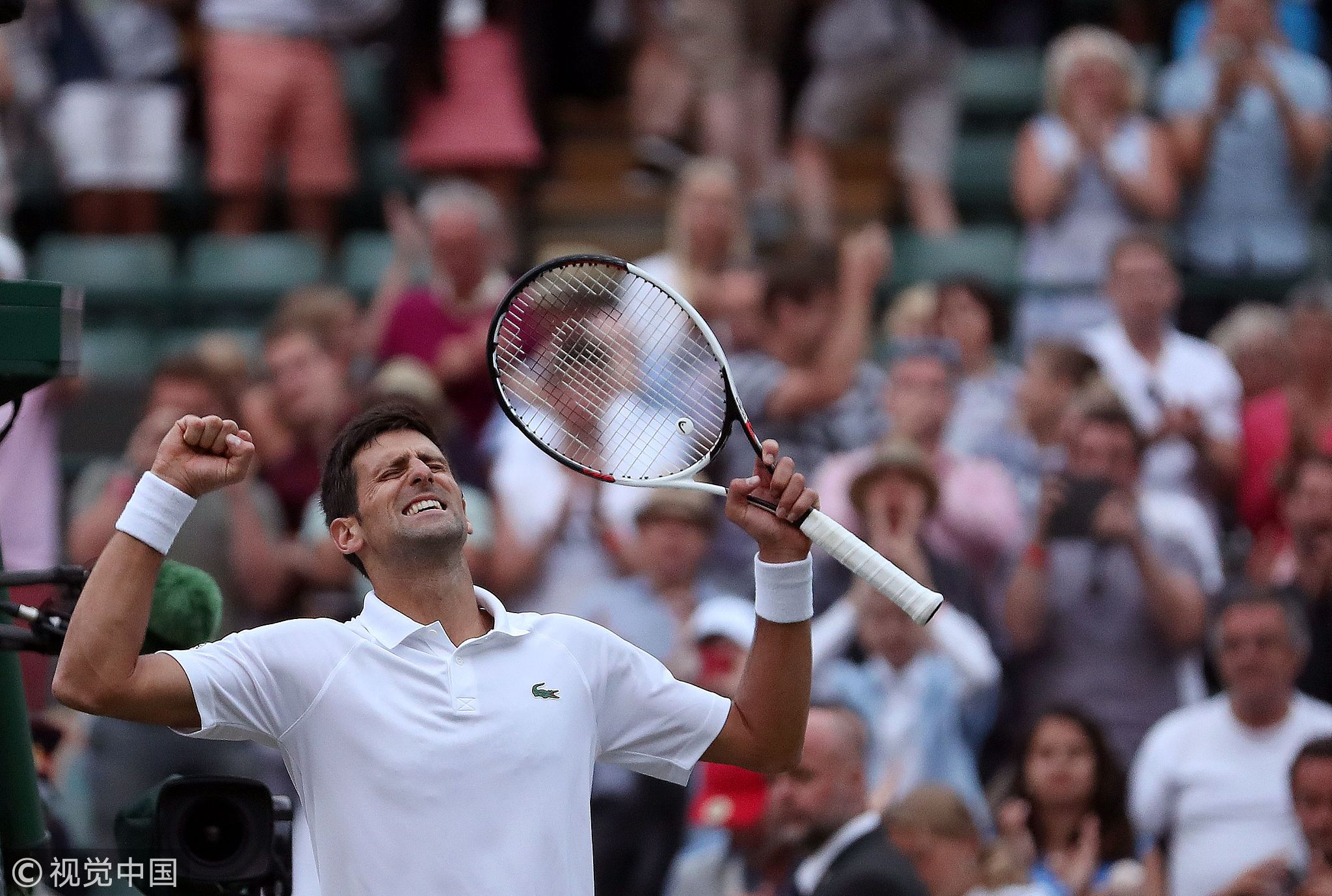 Serbia's Novak Djokovic celebrates after winning against Russia's Karen Khachanov during their men's singles fourth round match on the seventh day of the 2018 Wimbledon Championships on July 9, 2018, at All England Lawn Tennis and Croquet Club in London, England. /VCG Photo
