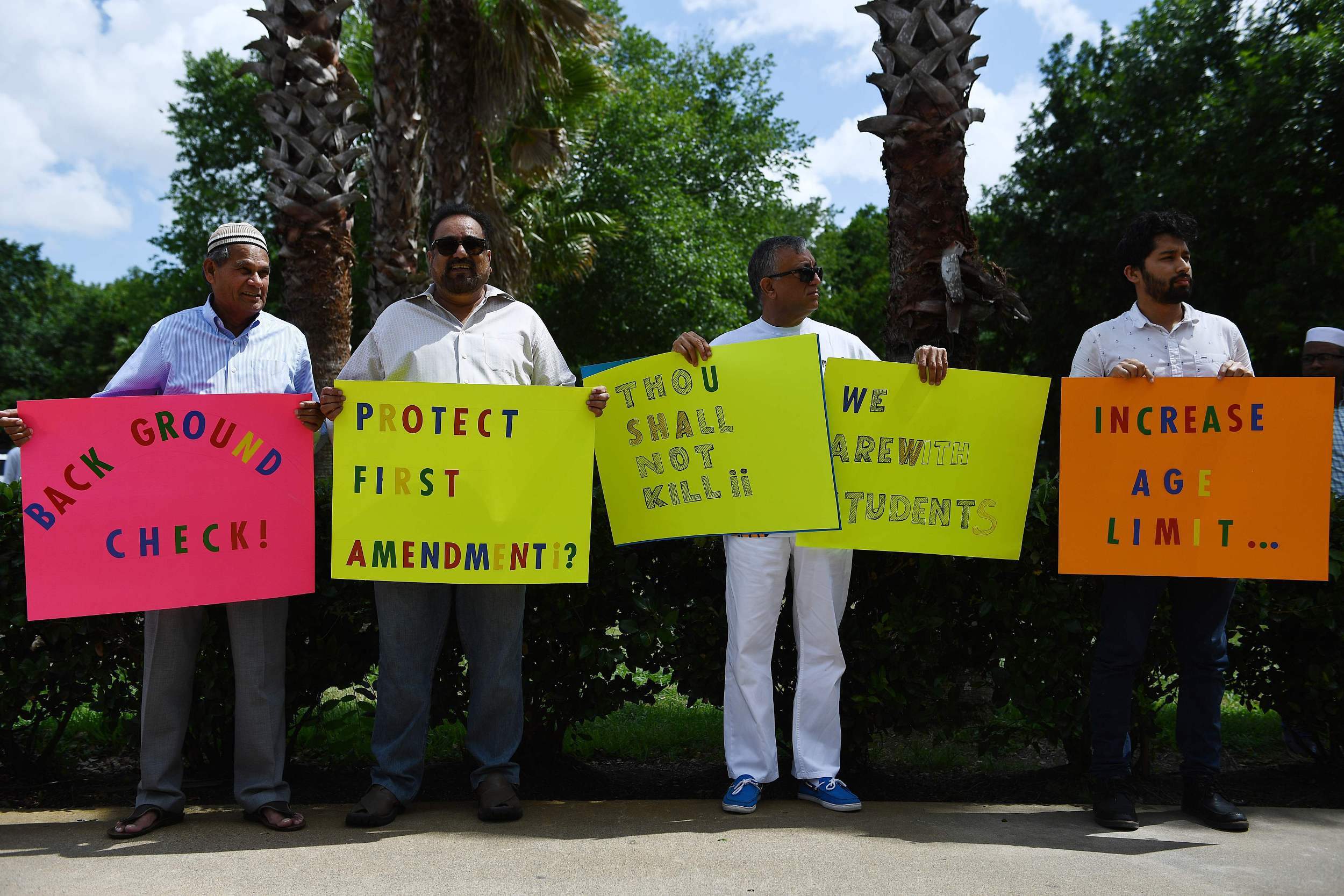 Protesters hold signs during the funeral service of Santa Fe High School shooting victim Sabika Sheikh, in Stafford, Texas, US, on May, 20, 2018. /VCG Photo