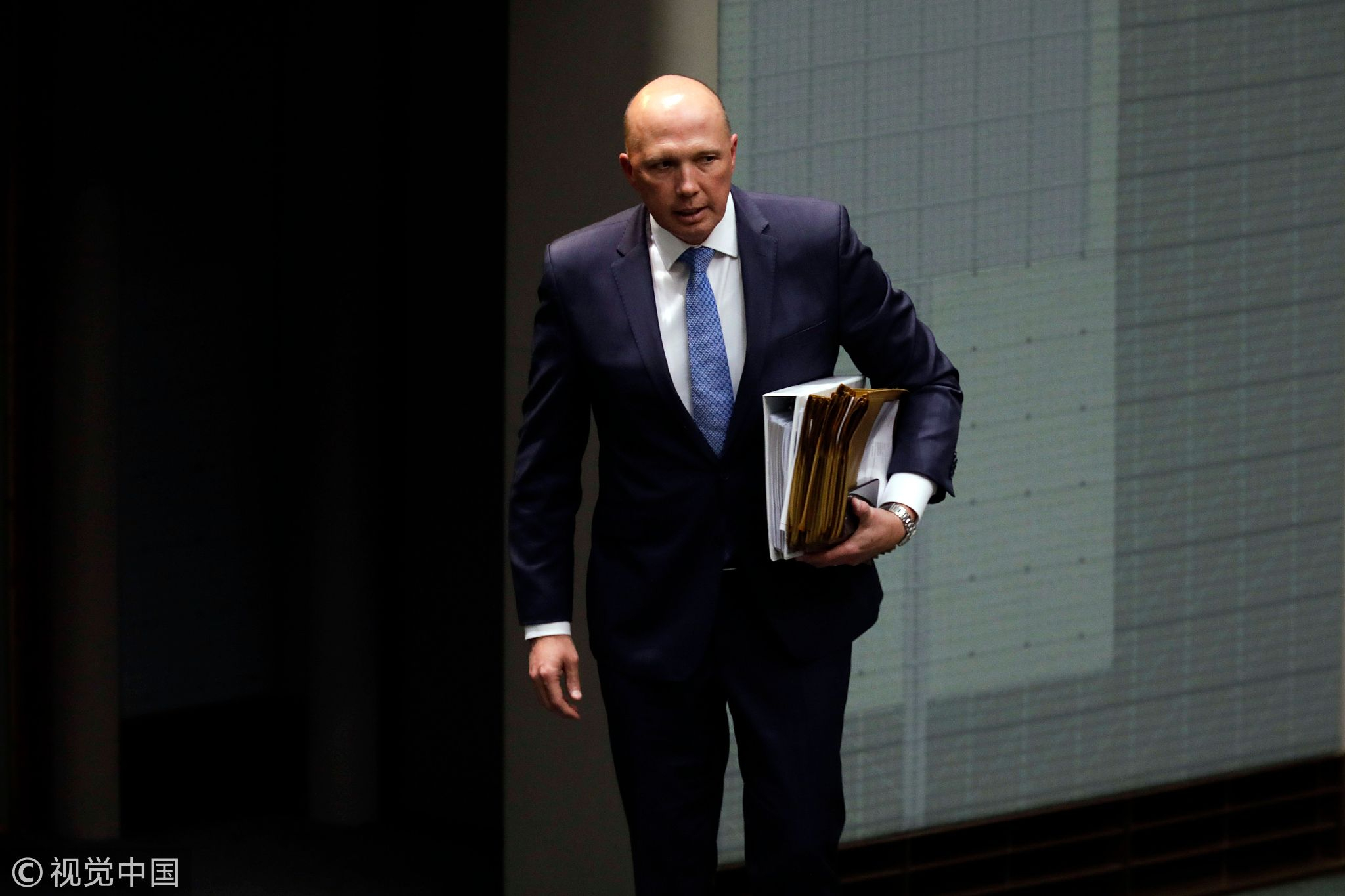 Australia's Minister for Home Affairs Peter Dutton arrives for a question and answer session at Parliament in Canberra on Aug. 20, 2018. /VCG Photo