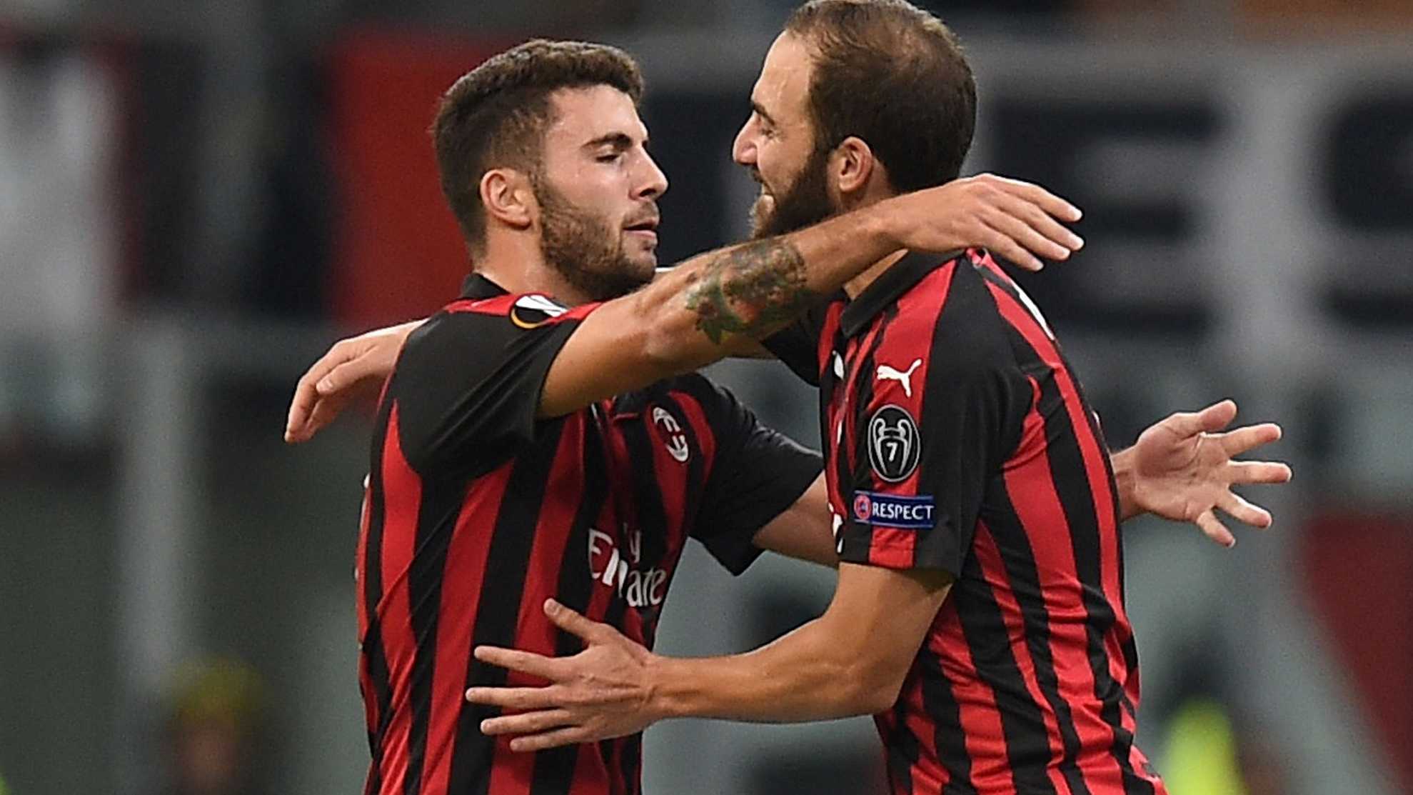 Patrick Cutrone (L) embraces teammate Gonzalo Higuain during the Europa League Group F clash between AC Milan and Olympiacos, October 4, 2018. /VCG Photo