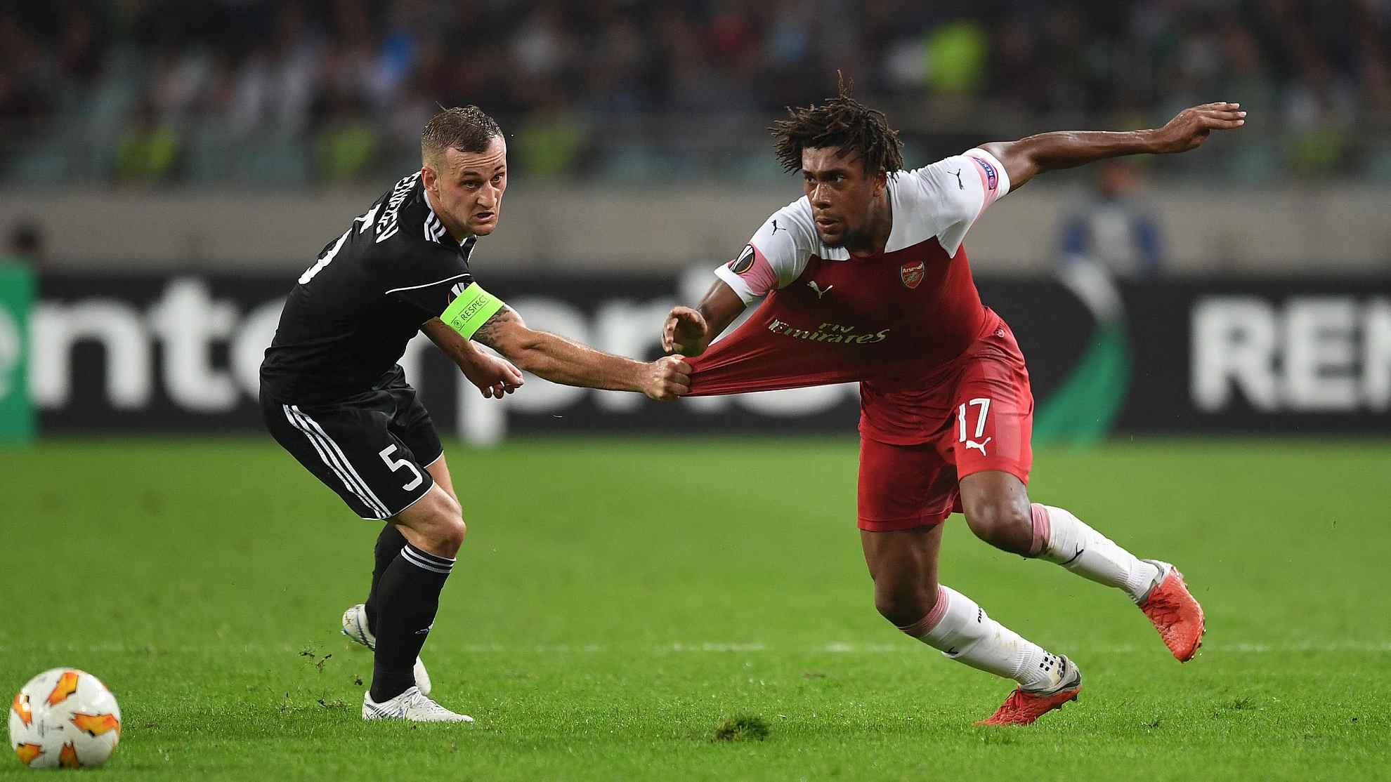 Arsenal's Alex Iwobi (R) is pulled back by Qarabag's Maksim Medvedev during their Europa League Group E match, October 4, 2018. /VCG Photo