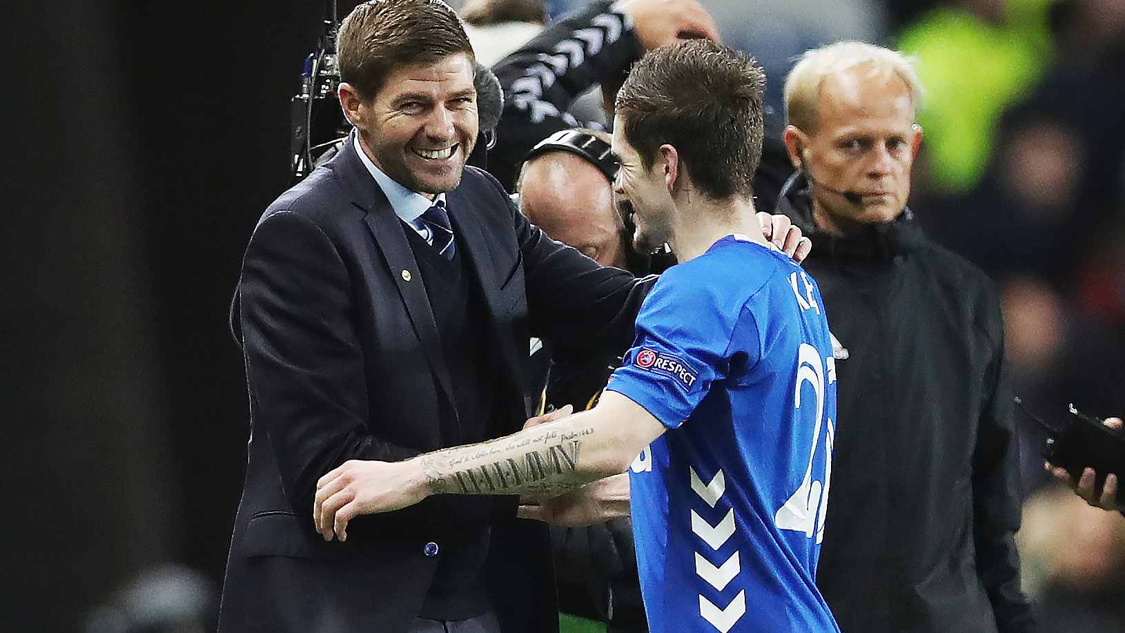 Rangers manager Steven Gerrard (L) celebrates with Ryan Kent at full time after the Europa League Group G match between Rangers and SK Rapid Wienon, October 4, 2018. /VCG Photo