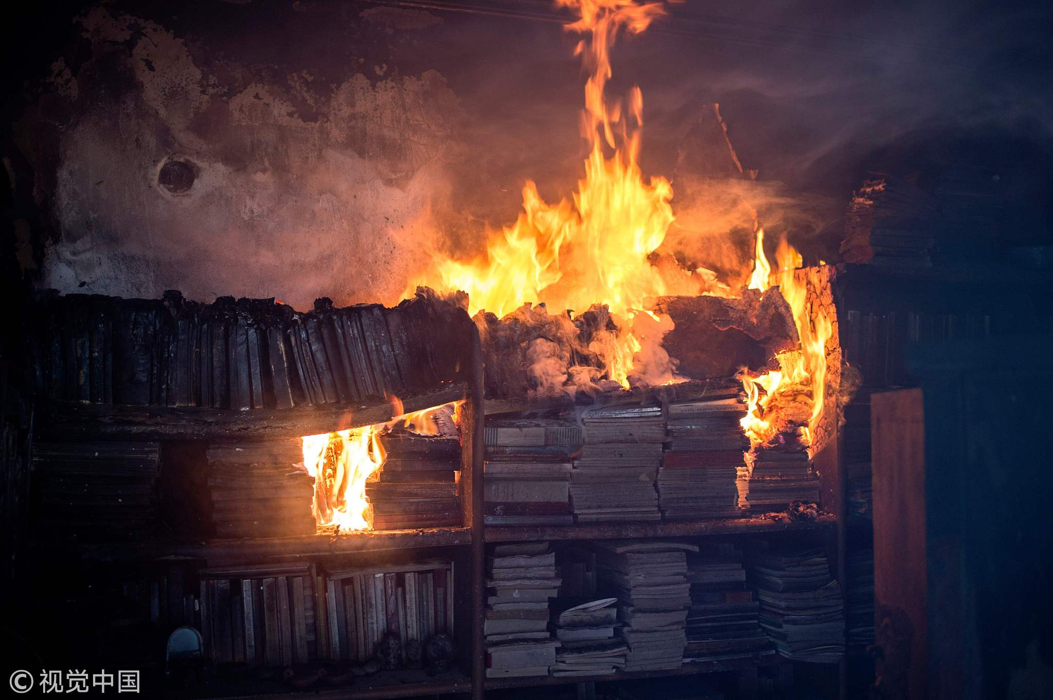 Books are burning inside a house following a wildfire in the village of Neos Voutzas, near Athens, July 25, 2018. /VCG Photo