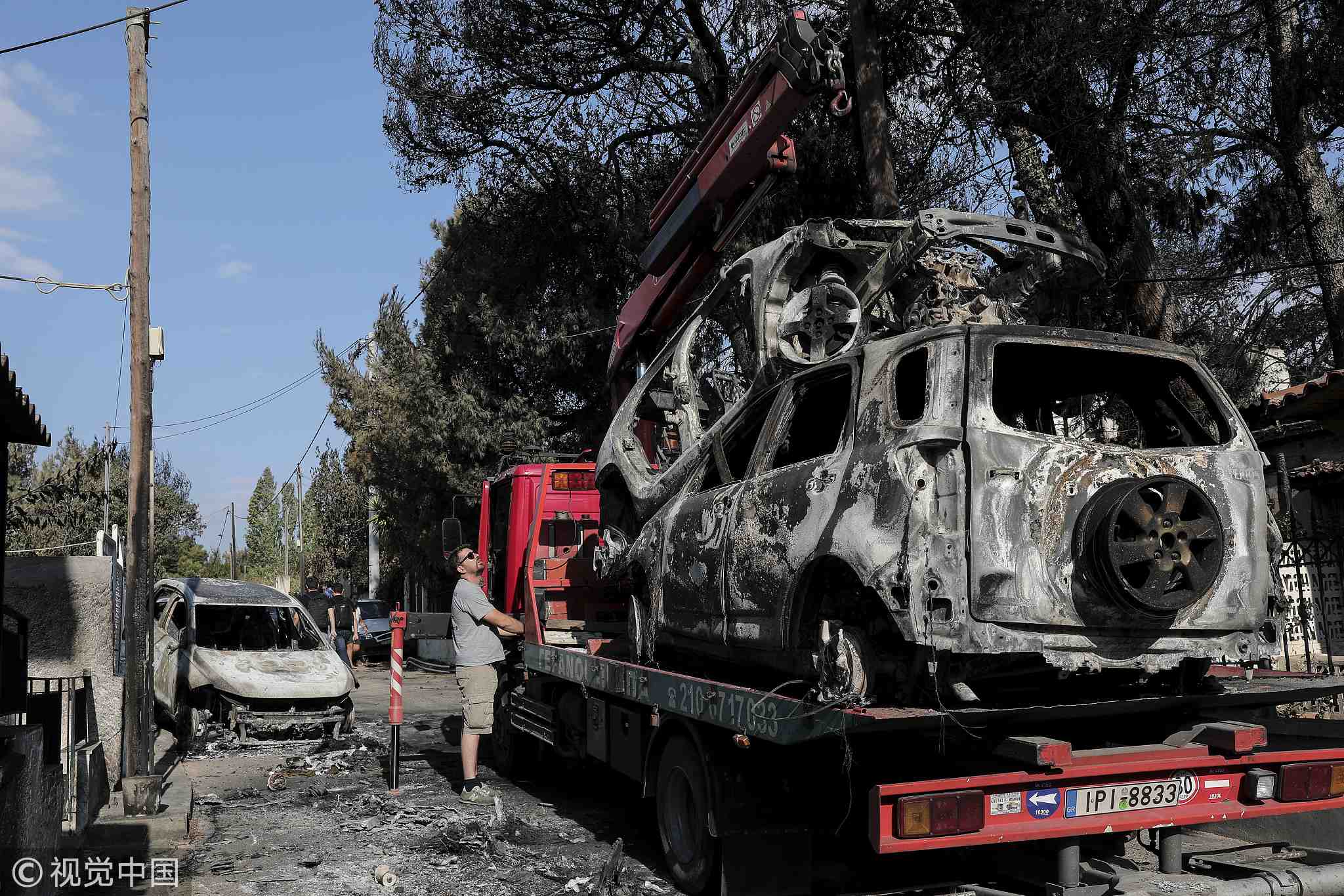 Burnt autmobiles are loaded onto a tow truck following a wildfire at Mati village, east of Athens, July 25, 2018. /VCG Photo