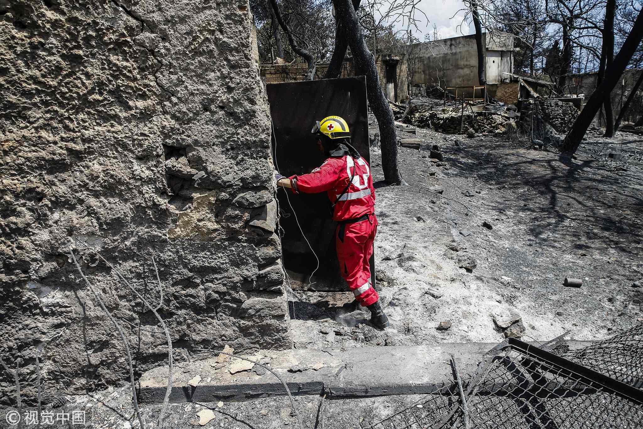 A member of rescue team inspects a damaged building after wildfires hit the village of Mati near Athens, July 25, 2018. /VCG Photo