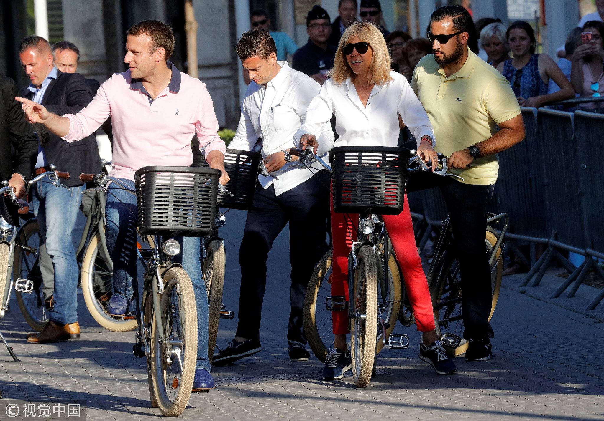 French President Emmanuel Macron, his wife Brigitte Macron, flanked by Alexandre Benalla, French presidential aide, ride their bicycles as they leave their home in Le Touquet, France, June 17, 2017. /VCG Photo