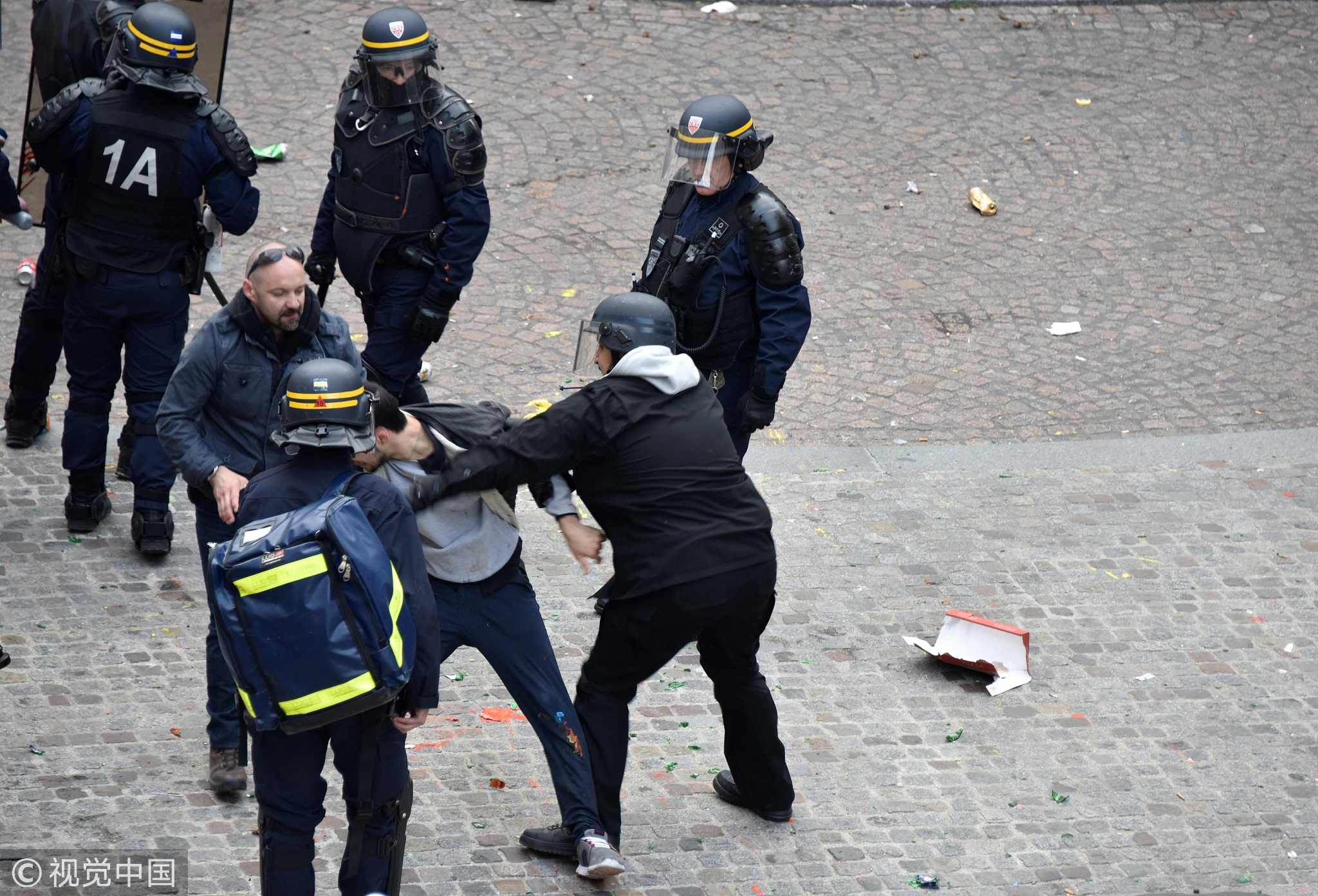 Elysee Chief Security Officer Alexandre Benalla (C) wearing a police visor, next to Vincent Crase (C, left) as they drag away a demonstrator during May 1 protests in Paris. /VCG Photo