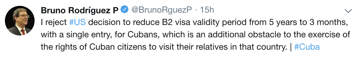 Cuba's Foreign Minister Bruno Rodriguez said via Twitter that the new restrictions were "an additional obstacle" for the many Cuban citizens who have relatives living in the United States.