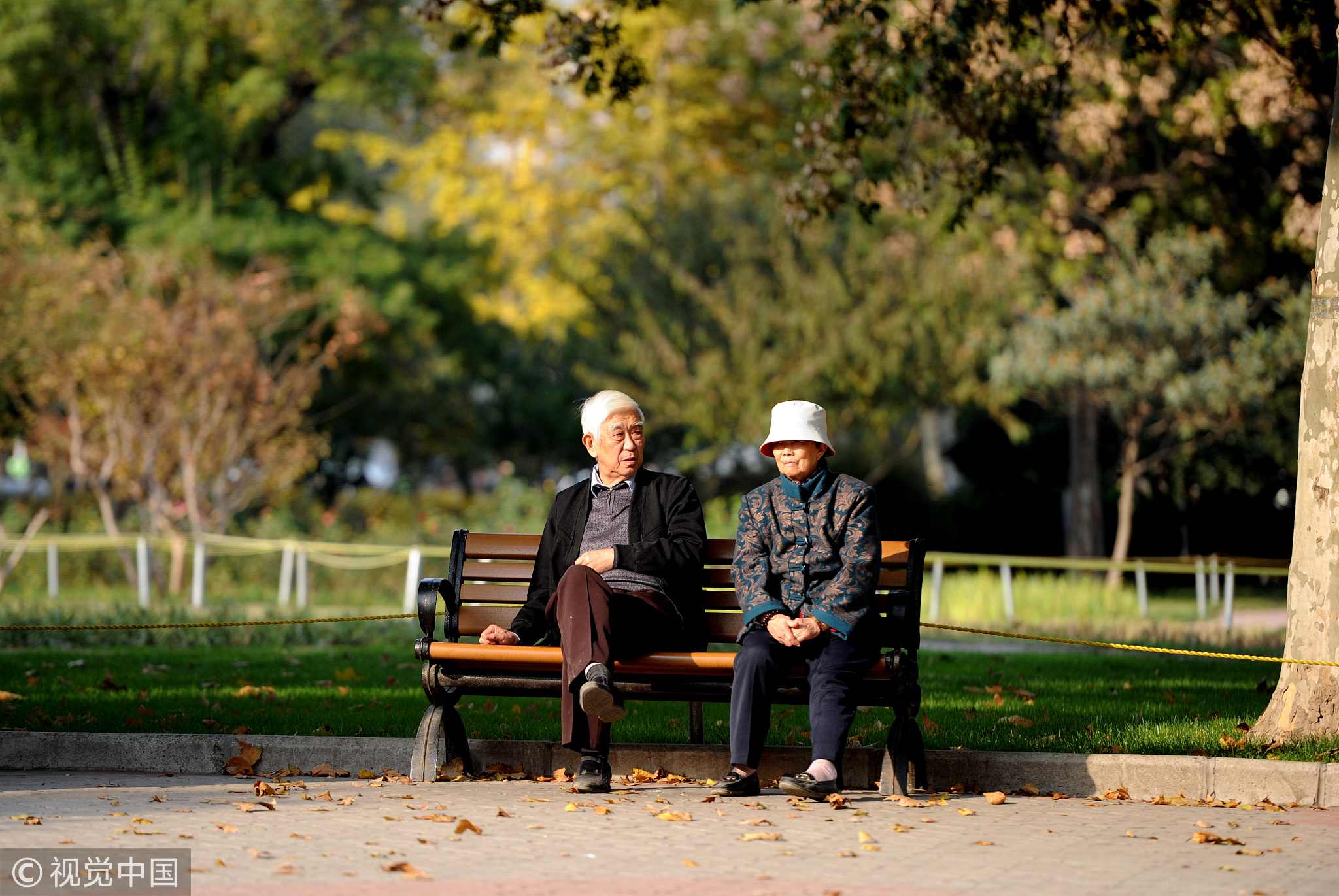 Two elderly people rest in a park in Zhengzhou, China's Henan Province. /VCG Photo