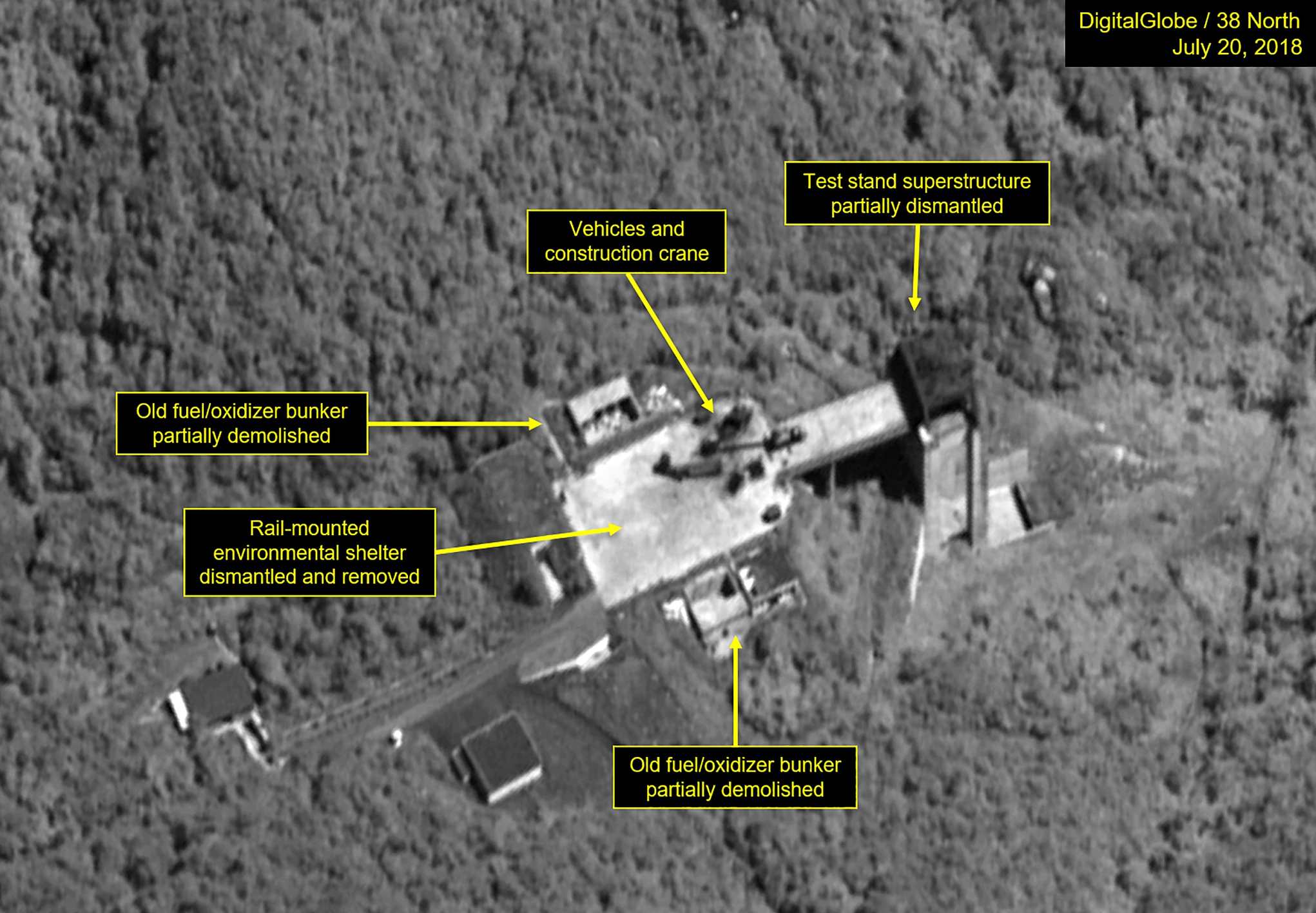 A US research group released its analysis of new satellite imagery on Monday, indicating that Pyongyang has begun taking down a processing building and a rocket-engine test stand that had been used to test liquid-fuel engines at its Sohae Satellite Launching Station while Pyongyang has offered no details as to how it might go about this.