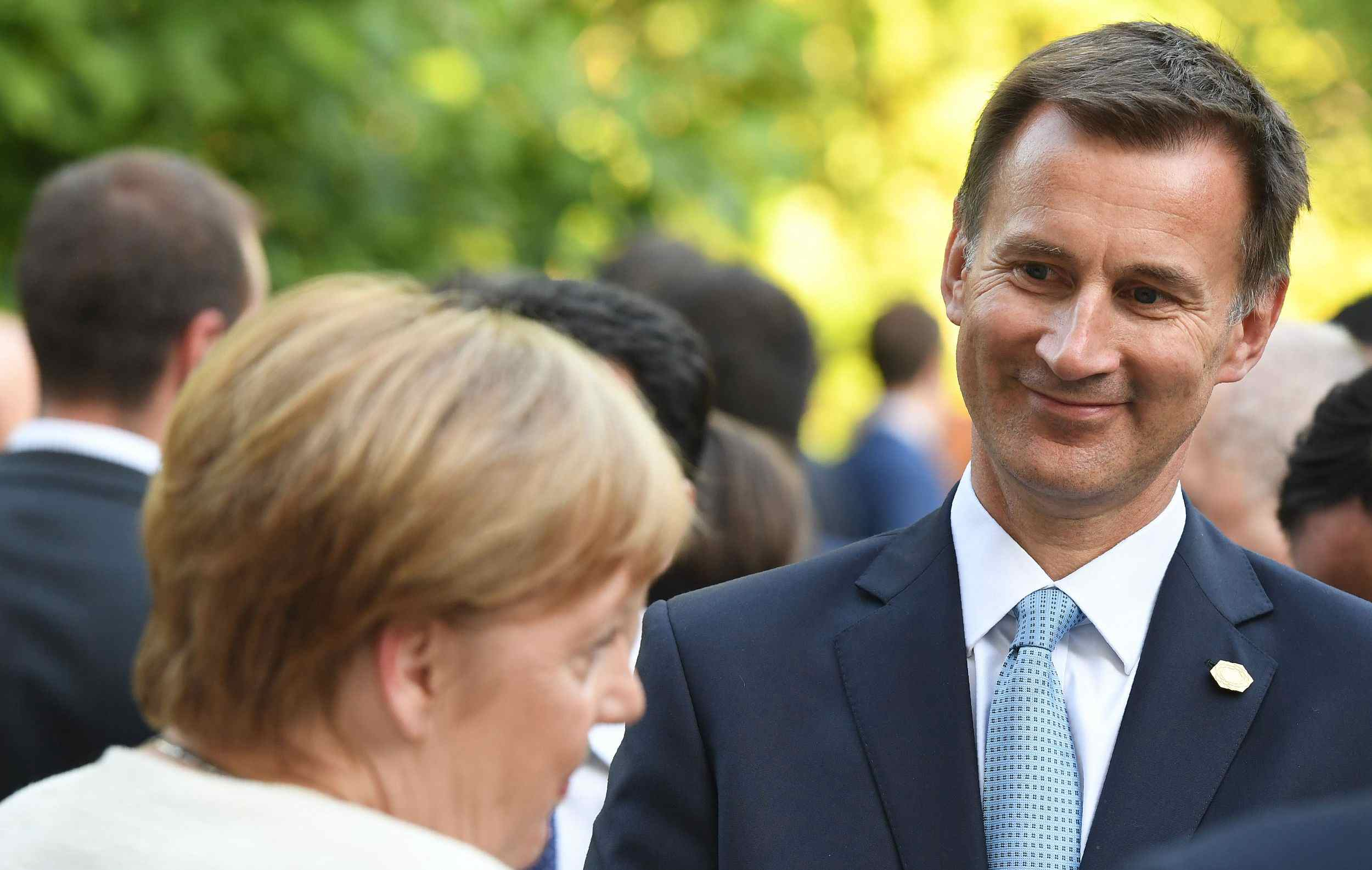 Britain's Foreign Secretary Jeremy Hunt (R) listens to German Chancellor Angela Merkel during a reception in the gardens of St James's Palace in central London on July 10, 2018. /VCG Photo