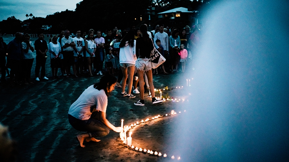 Crowds gather on Takapuna beach for a vigil in memory of the victims of the Christchurch mosque terror attacks in Auckland, March 16, 2019. /VCG Photo