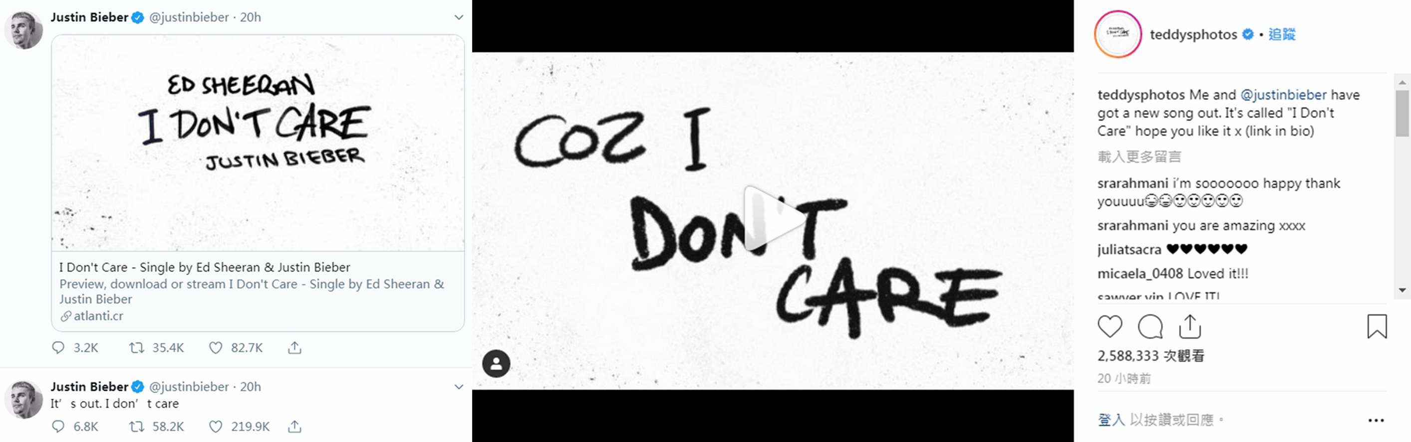 Screenshots of Twitter and Instagram posts by Justin Beiber and Ed Sheeran.