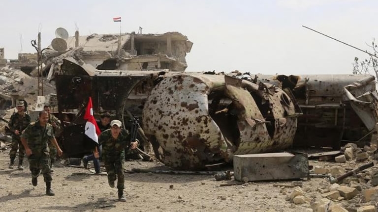 This April 29, 2018 photo taken during a government guided tour in Damascus' southern al-Qadam neighborhood shows Syrian army forces running for cover from sniper fire from ISIL group positions in Yarmuk, a Palestinian refugee camp on the edge of the capital. /AFP Photo
