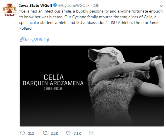 A Twitter post by the Iowa State women's golf team memorializing Celia Barquin Arozamena on September 18, 2018. /Screenshot from Twitter @CycloneWGOLF