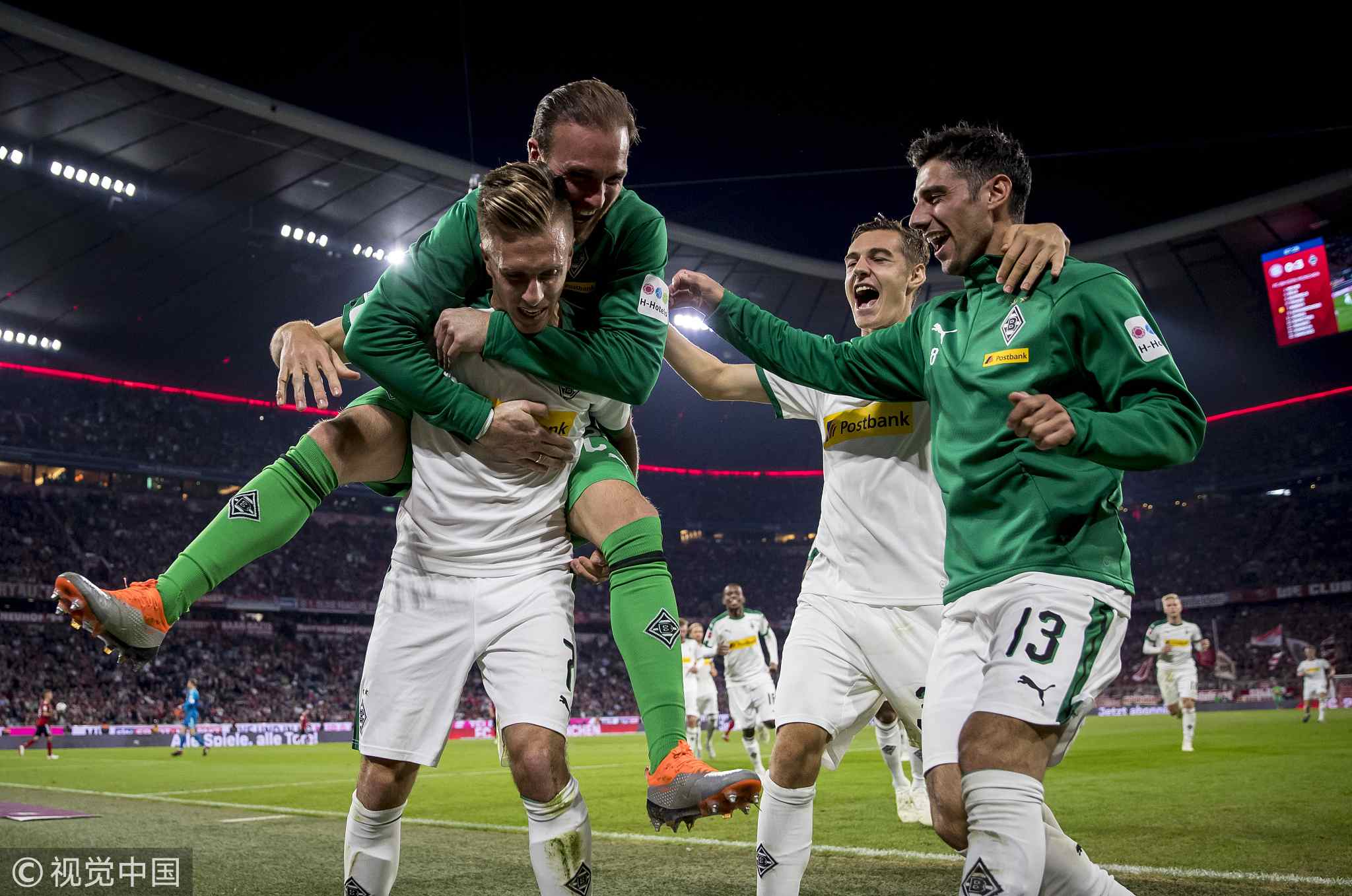 Patrick Herrmann of Borussia Monchengladbach celebrates with his team mates after he scores his teams third goal during their Bundesliga match against Bayern Munich at Allianz Arena in Munich, Germany, October 06, 2018. /VCG Photo