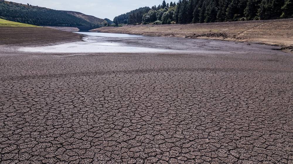 Baked mud floors can be seen as water levels continue to fall in many of the UK's reservoirs, prompting hose pipe bans in North West England, July 25, 2018. /VCG Photo