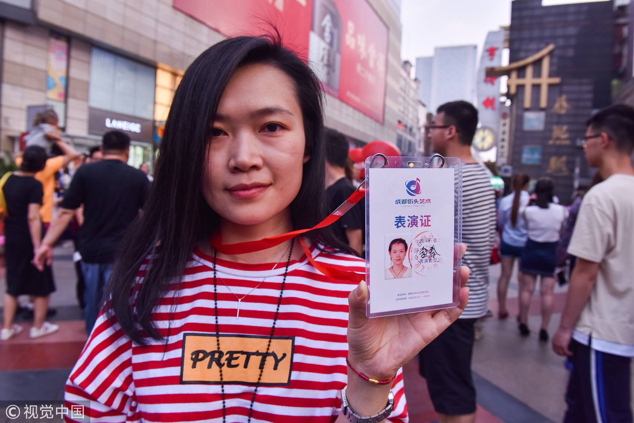 A street artist in Chengdu City shows her pass. /VCG Photo