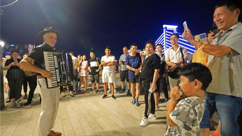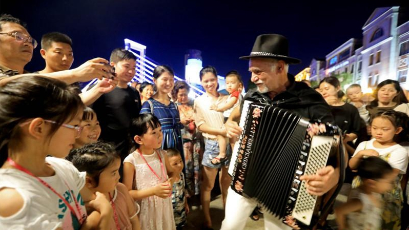 Jon, a Spanish accordionist, entertains the crowd at an art district in Ningbo City. /Photo via People.cn