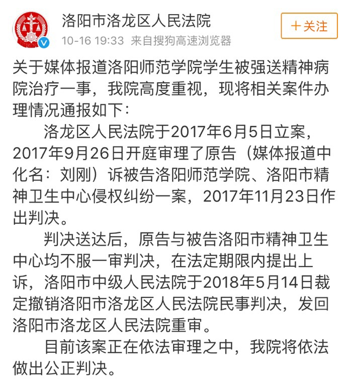The People's Court of Luolong District responded that they had ordered a second trial. / VCG Photo
