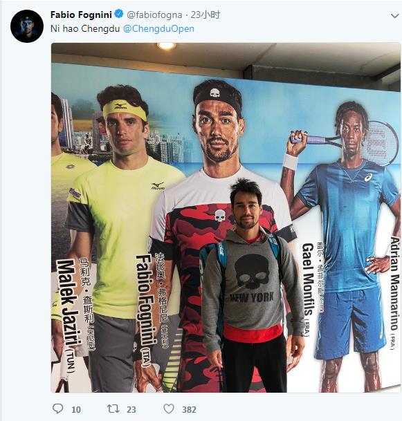 Fabio Fognini tweets his arrival in Chengdu with a photo showing him in front of his giant poster image during the ATP Chengdu Open. /Screenshot from Twitter