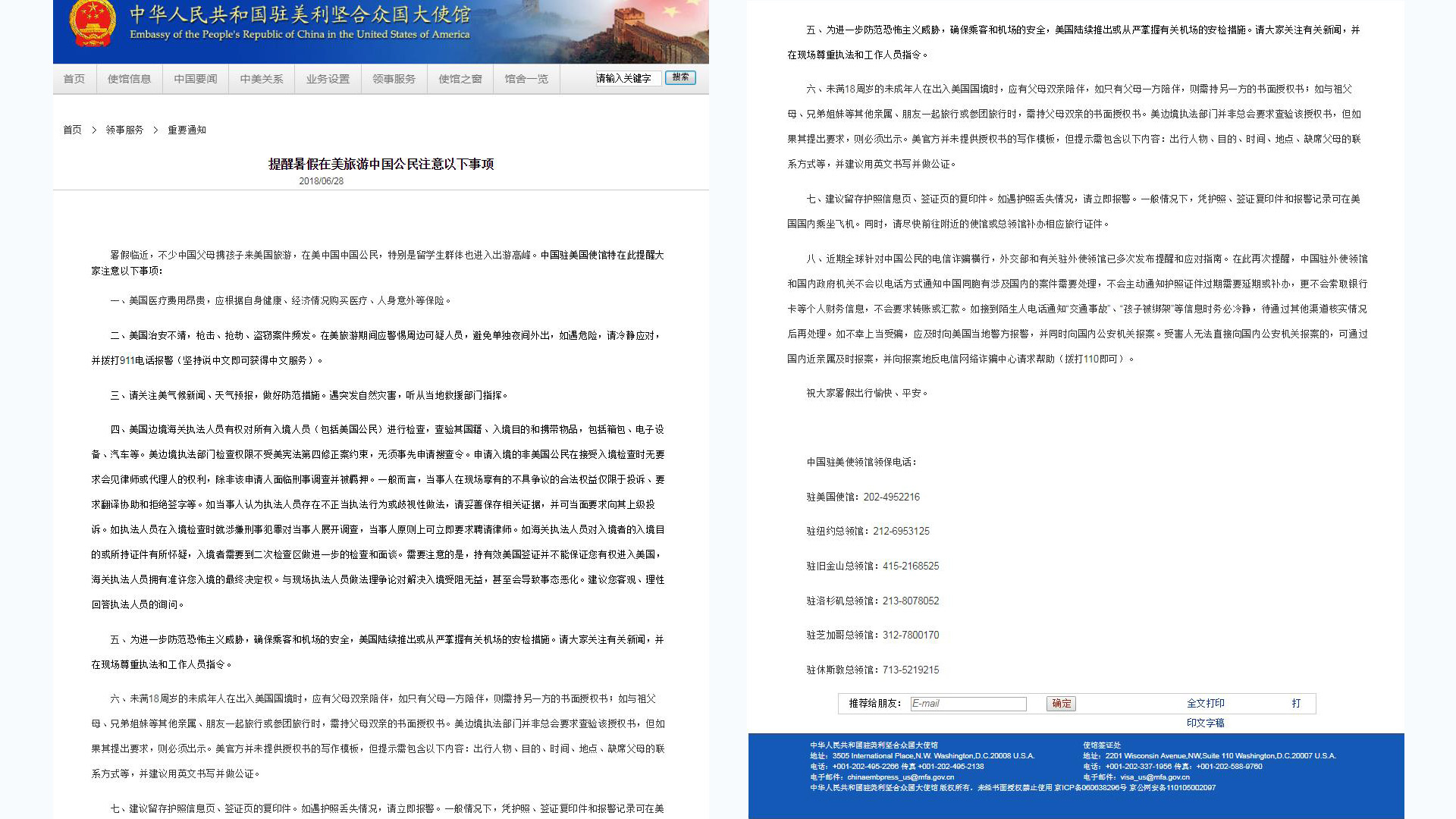A combination of two screenshots from the official website of the Chinese Embassy in the US showing the latest travel advisory, posted in Mandarin on June 28, 2018.