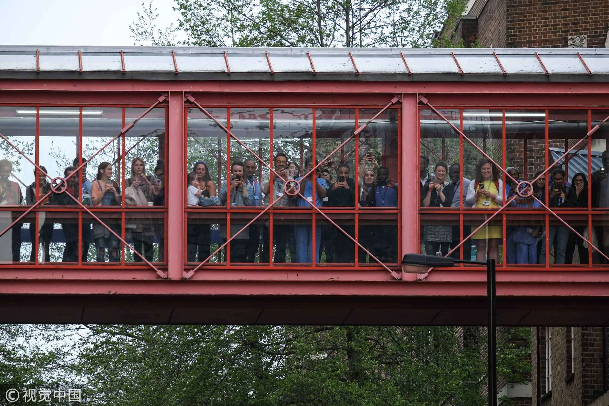Royal well-wishers watch from above as the Duke and Duchess of Cambridge and their newborn son depart the Lindo Wing, St Mary's Hospital in Paddington, London,UK, on April 23, 2018. /VCG Photo