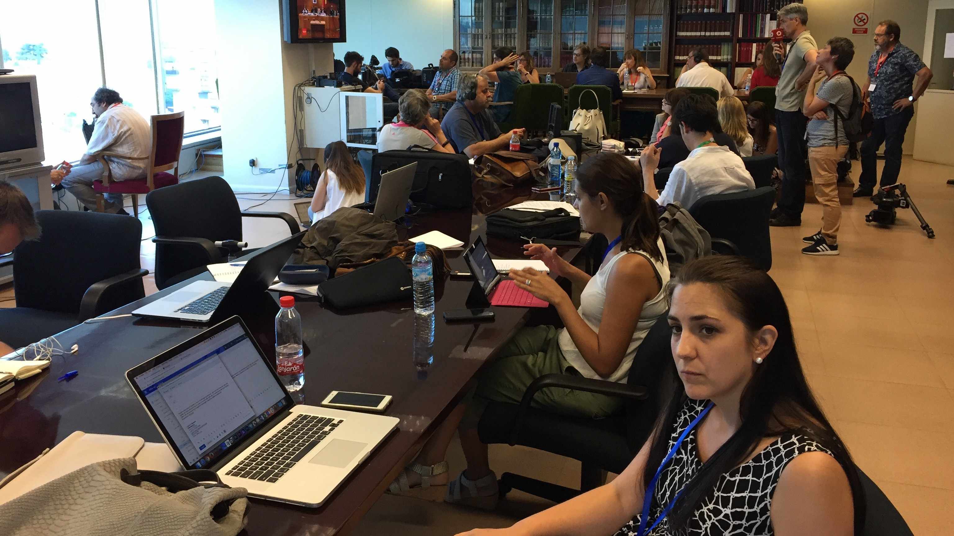 Inés Madrigal(L) and her lawyer stand outside the court house. /CGTN Photo