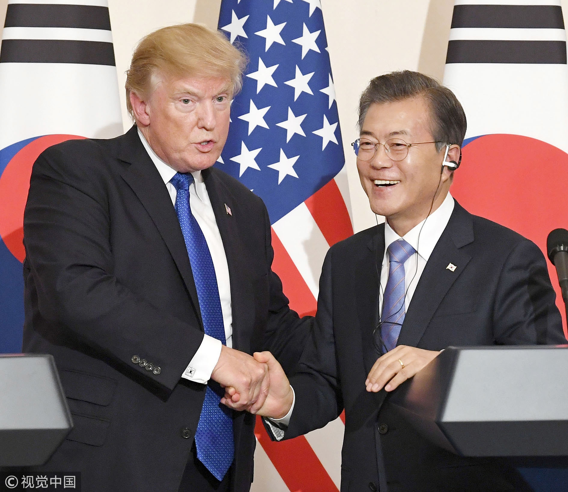 November 7, 2017: US President Donald Trump (L) and his ROK counterpart Moon Jae-in shake hands after a joint press conference in Seoul. /VCG Photo