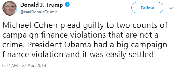 US President Donald Trump on Wednesday said the campaign finance violations his longtime lawyer Michael Cohen pleaded guilty to in federal court on Tuesday were “not a crime,” even though prosecutors and Cohen agreed they were.