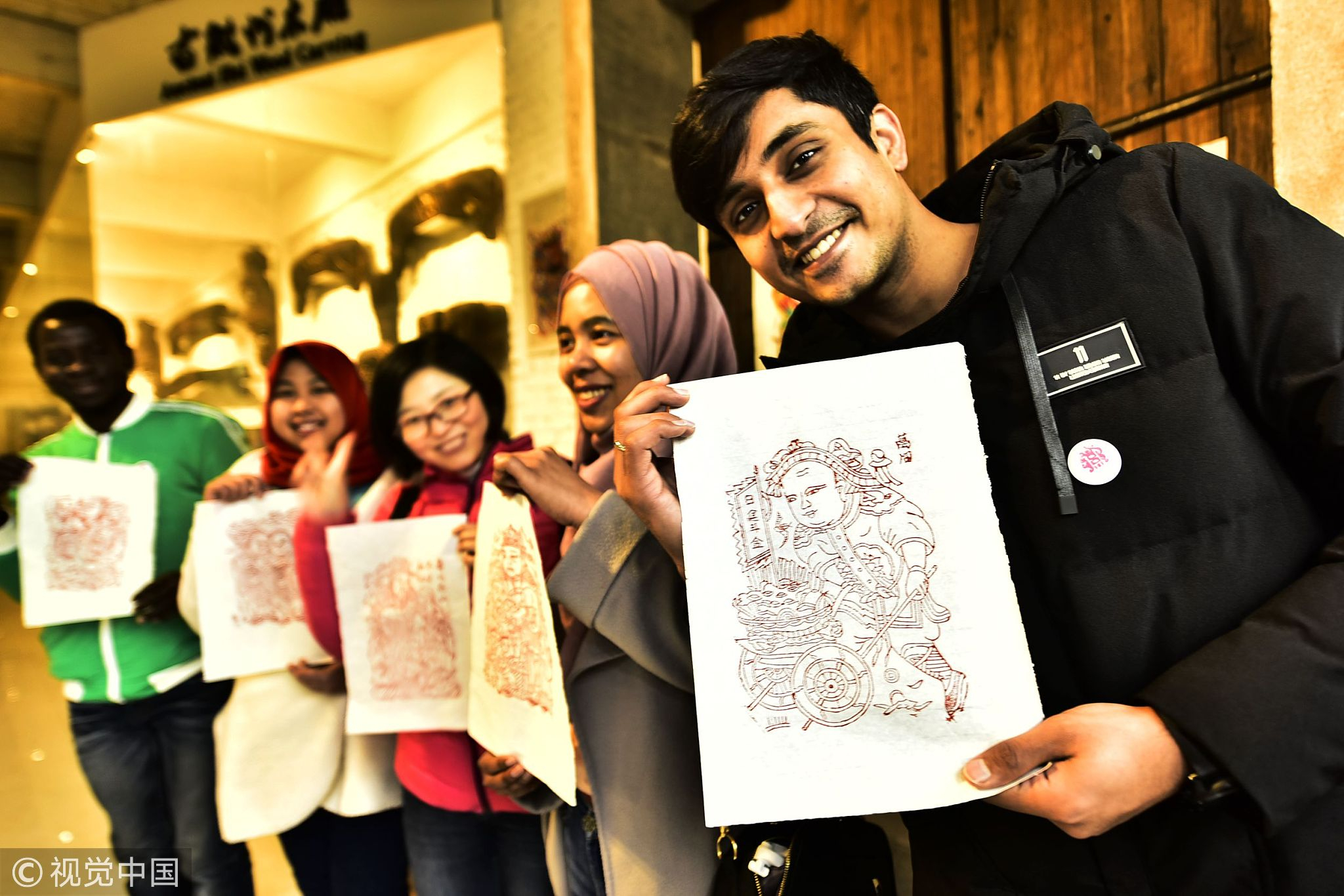March 2, 2018: Overseas students from Pakistan, Indonesia and Benin experience the charm of Chinese culture in a Folk Museum in Hefei, Anhui Province. / VCG Photo
