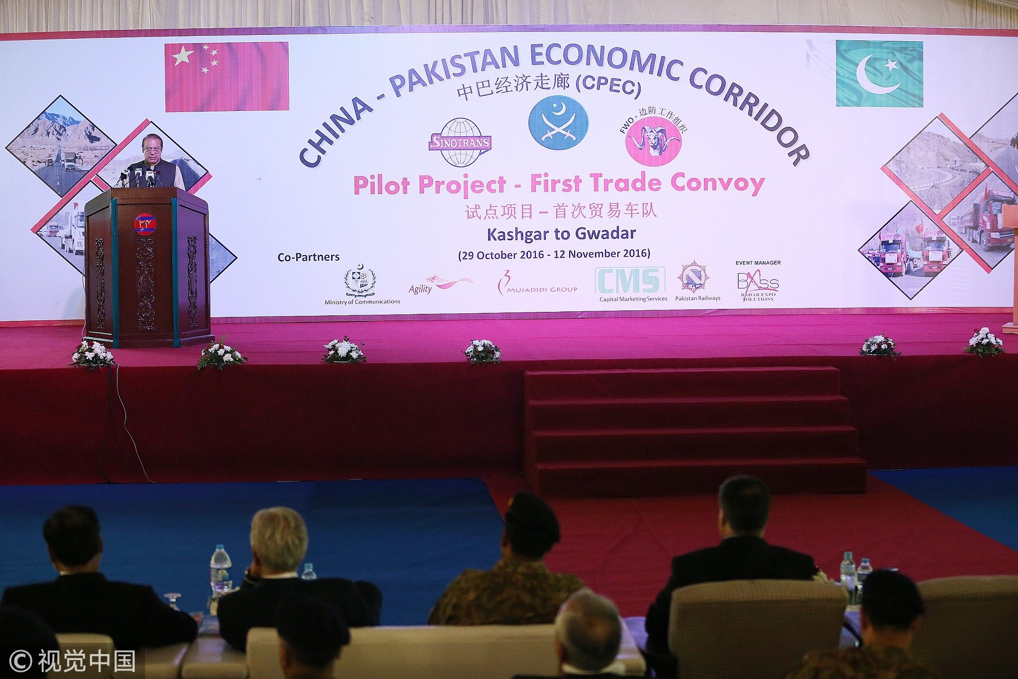 Pakistani Prime Minister Nawaz Sharif attend a ceremony held at Gwadar port, a key part of the 46-billion-US-dollar China-Pakistan Economic Corridor (CPEC), to celebrate the arrival of a Chinese trade convoy that had travelled 3,000 kilometers from northwest China's Xinjiang Uygur Autonomous Region. / VCG Photo