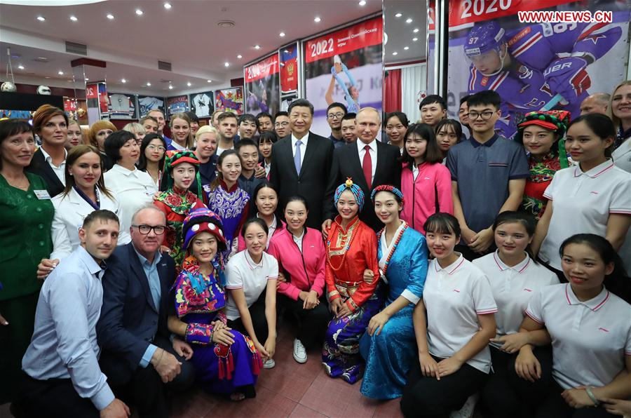 Chinese President Xi Jinping, accompanied by Russian President Vladimir Putin, visits the All-Russian Children's Center "Ocean" in Vladivostok for a conversation with a group of school children on Sep. 12, 2018./Xinhua Photo