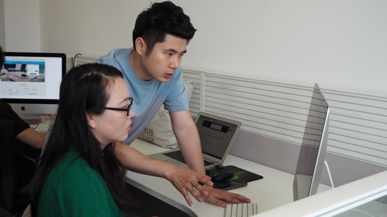 Huang Bingchi (left 2), CEO of Qianhai Gooplayer Technology, discusses product designing with colleague in Qianhai-Shekou FTA, Shenzhen, south China. /CGTN Photo