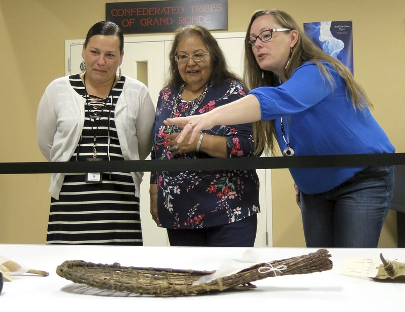 From left, Confederated Tribes of the Grand Ronde council member Kathleen George, tribal chairwoman Cheryle Kennedy and tribal council administrative assistant Shannon Simi admire objects, May 23, 2018, in Grand Ronde, Ore., that was collected in the 1870s by the Rev. Robert Summers. /AP Photo