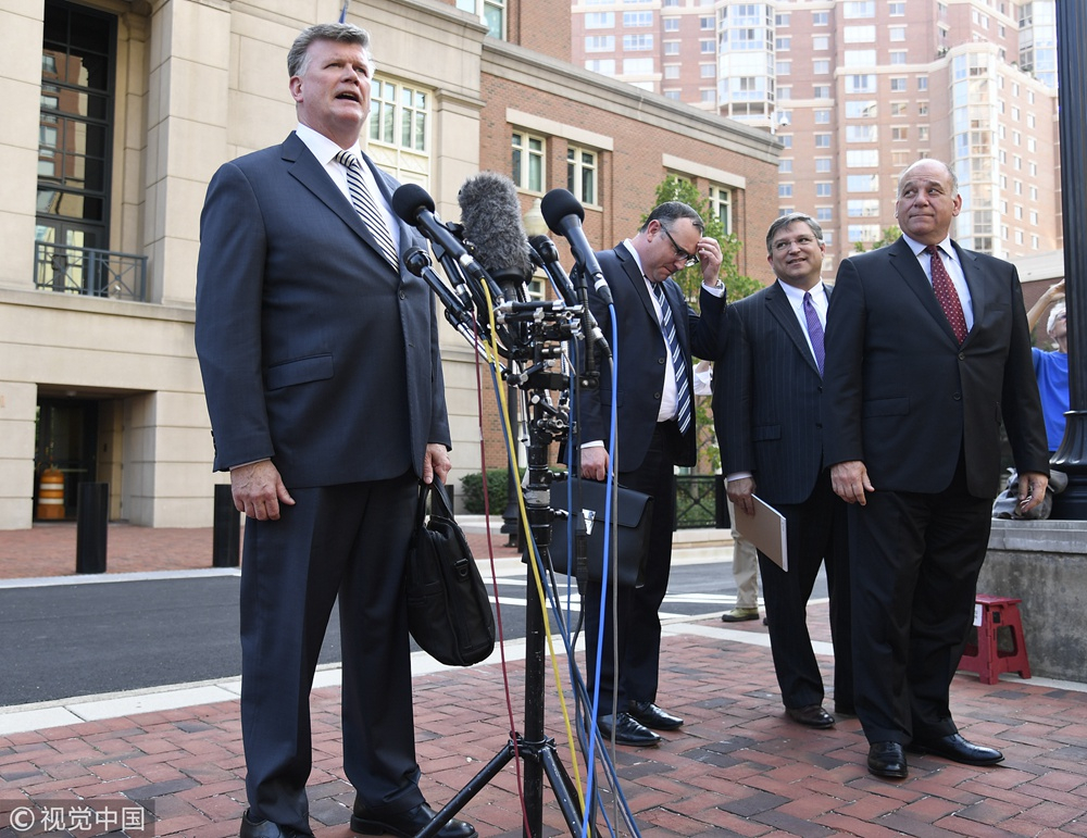 Lead attorney Kevin Downing (L) makes remarks to the press at the conclusion of the first day of jury deliberations at the Albert V. Bryan US Courthouse in Alexandria, Virginia, US, August 16, 2018. /VCG Photo