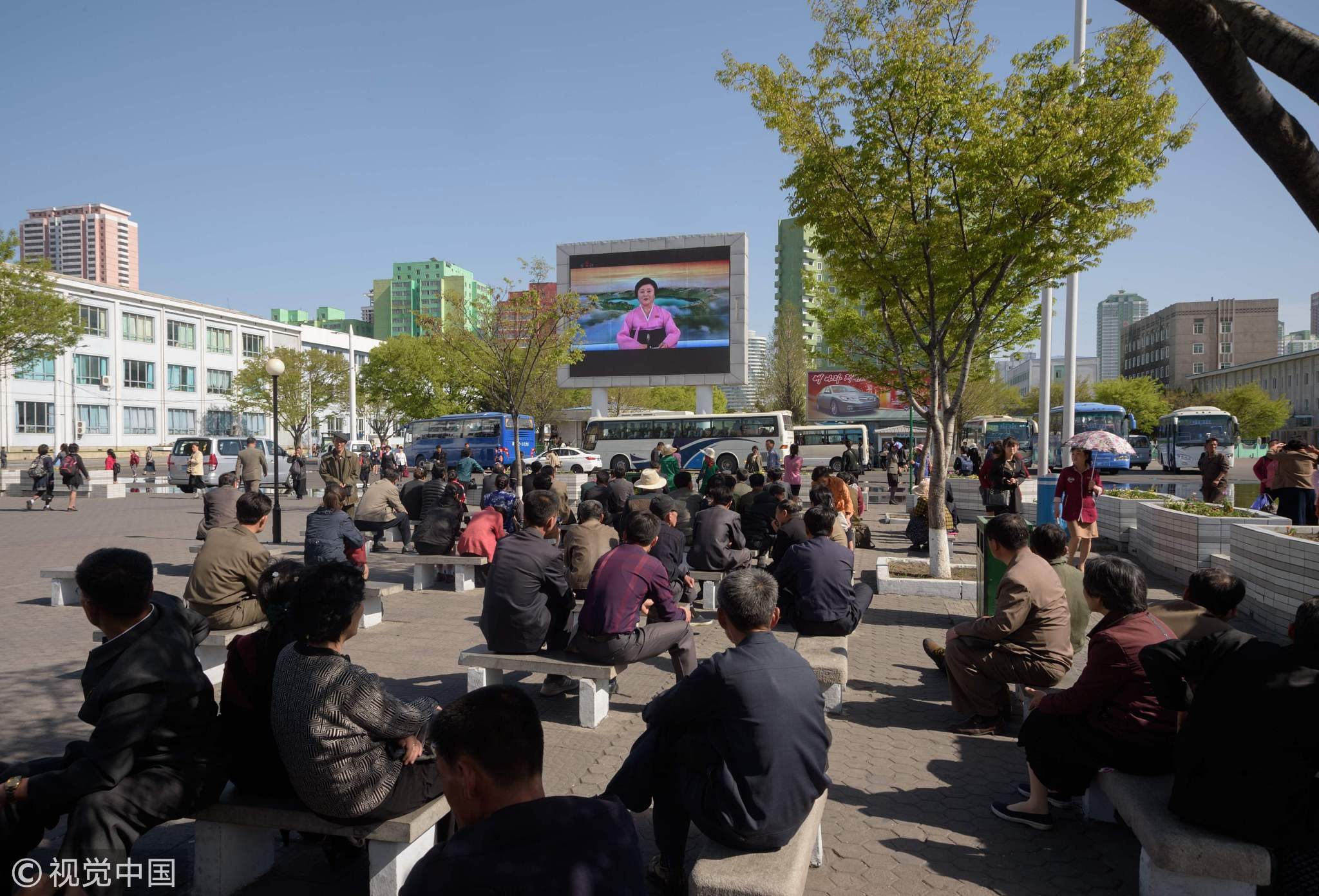 People watch a public television screen showing coverage of the Third Plenary Meeting of the 7th Central Committee of the Workers' Party in Pyongyang, April 21, 2018. /VCG Photo