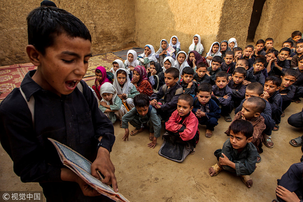 A boy recites from a book during a lesson at a school in a slum on the outskirts of Islamabad, Pakistan. /VCG Photo