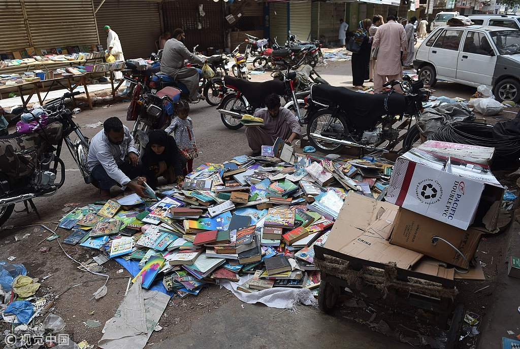 A Pakistani family are searching for second-hand books at a makeshift stall in Karachi, Pakistan, September 16, 2018. /VCG Photo
