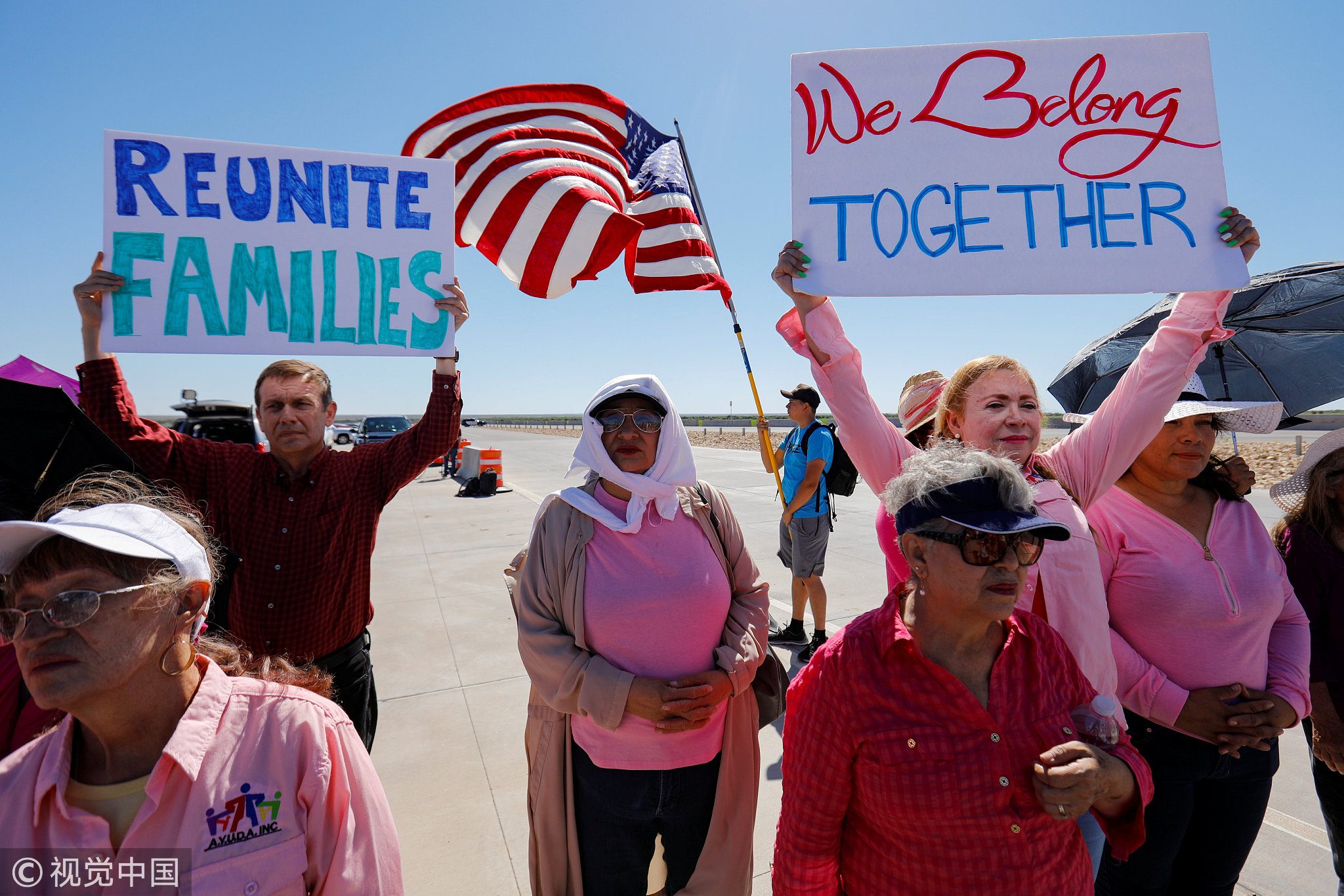A small group of demonstrators protests outside of the children's tent encampment built to deal with the Trump administrations "zero tolerance" policy in Tornillo, Texas, US June 21, 2018. /VCG Photo